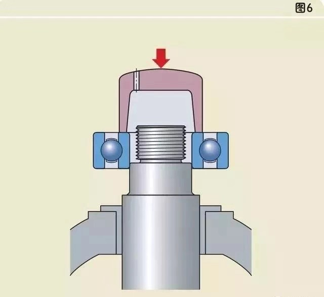 安裝配合不是太緊的小軸承時(shí),可以通過(guò)一個(gè)套筒(圖5、圖6)并以錘擊的方法,輕輕敲擊套筒把軸承裝到合適的位置。敲擊時(shí)應(yīng)盡量均勻的作用在軸承套圈上,以防止軸承傾斜或歪斜。